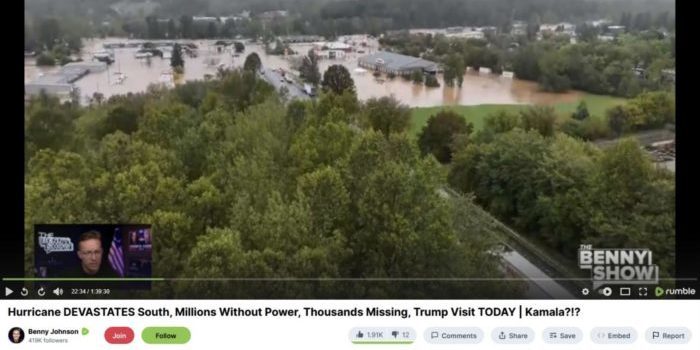 (Ken Silva, Headline USA) “The Benny Show,” hosted by conservative grifter Benny Johnson, is being sued for allegedly cribbing someone’s video of flooding in Black Mountain, North Carolina from Hurricane Helene last year.